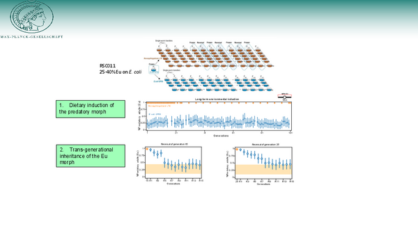 To obtain comprehensive evidence for the significance of developmental plasticity for evolution, we have started during the Corona pandemic, unprecedented long-term environmental induction experiments through experimental evolution (Fig. 2). Specifically, we investigated the interplay between feeding structure plasticity and the environment on an evolutionary time scale, by subjecting a total of 110 isogenic nematode lines to different bacterial diets (E. coli vs. Novosphingobium) for more than 100 generations (Fig. 2). This long-term evolution experiment illustrates i) systemic dietary induction of the predatory mouth form (Fig. 2), and ii) transgenerational epigenetic inheritance (TEI) of the predatory phenotype after food reversal (Fig. 2). In our case, TEI requires a dietary induction of at least five generations, which is distinct from previously described examples of TEI in C. elegans (see Area 2 below). These significant findings are at the center of our current work and the work that the Department will focus on in the coming years. They are described below: